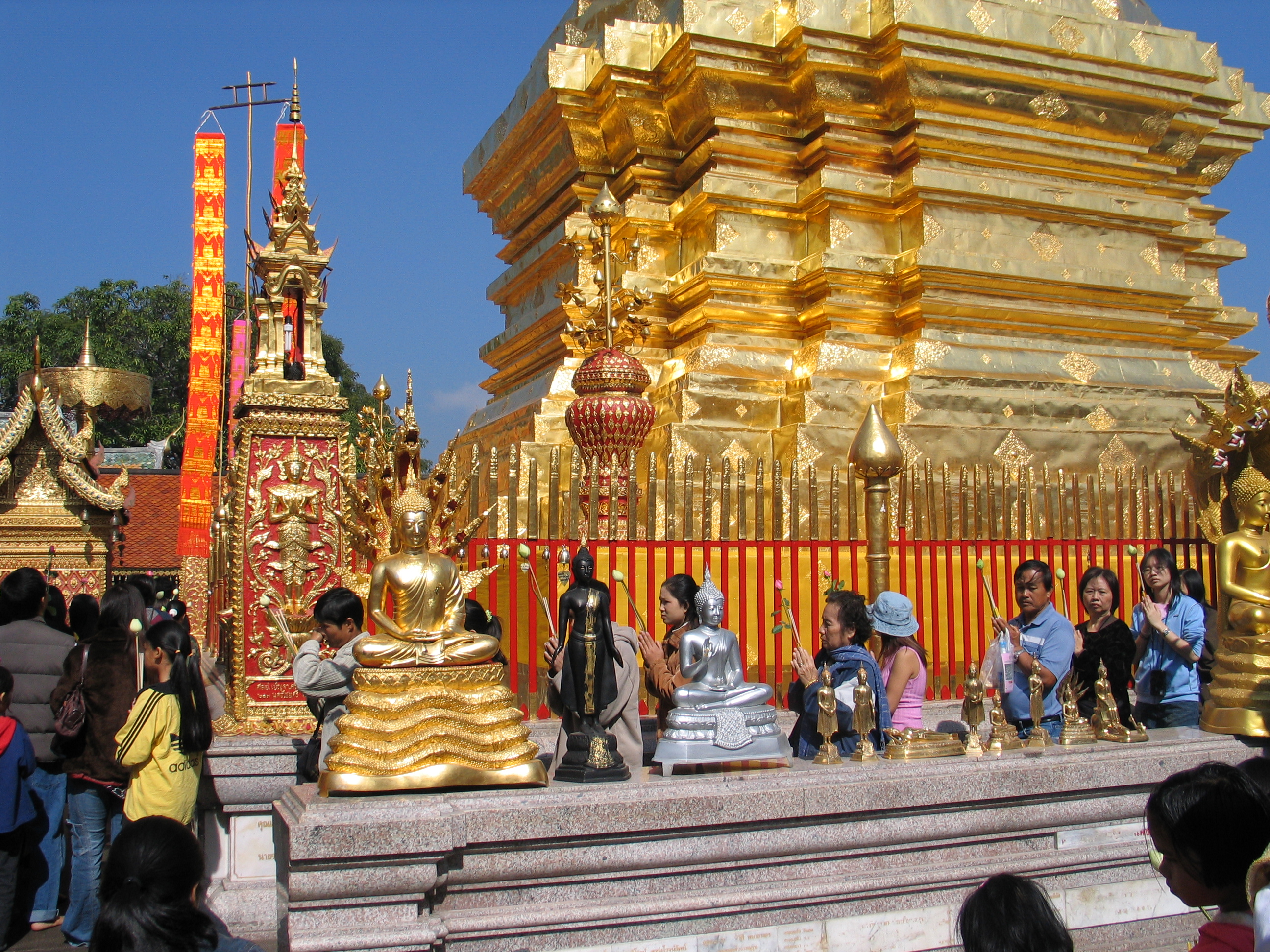 It’s always good to make lemonade from lemons, to turn a negative into a positive. With an unexpected week added to our stay in Chiang Mai, we were able to settle into this northern capital city as New Year 2005 approached and arrived. We would not be disappointed. All of the usually festive activities reflected a serious tone appropriate to the disaster caused by the Indian Ocean Tsunami. Of all our excursions, our New Year’s Day visit to the Vatican of Thai Buddhism, Wat Phra That Doi Suthep, was the highlight.