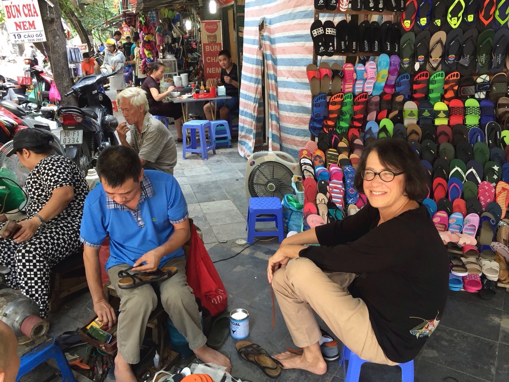 My wife Jan experienced a sandal strap becoming undone because of the humidity. We asked our friend Vu Nhat Tan if we could get it repaired, and after a few seconds of thought we bounded together onto Shoe Area in the Old Quarter. Problem solved in under one hour.