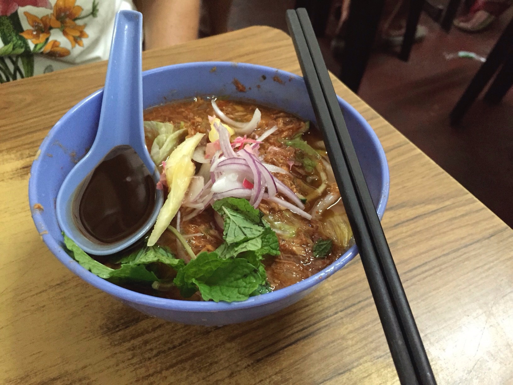 Laksa is a Southeast Asian coconut milk soup cauldron of spices and noodles, unique herbs (if you can find Vietnamese rau rom outside of Malaysia you’re good to go) with submerged surprises in each bowl. It might be a good thing that you don’t know exactly what’s in it! Now, asam laksa is a little particular to Georgetown. And if you look at the blue spoon, it contains a tamarind syrup that transforms the sweetness of the coconut taste to a heavenly level of spicy goodness. It’s the tamarind that makes it asam.